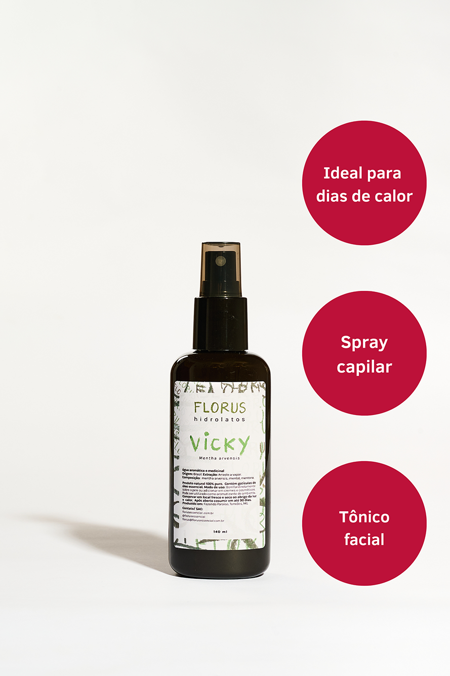 Para a pele: O hidrolato de Vicky é extremamente refrescante e é conhecido por revitalizar a pele e os sentidos. Ele proporciona uma sensação imediata de frescor, sendo ideal para o uso em climas quentes ou após atividades físicas intensas. Além disso, esse hidrolato possui propriedades antissépticas e antibacterianas, que ajudam a limpar a pele e prevenir infecções.