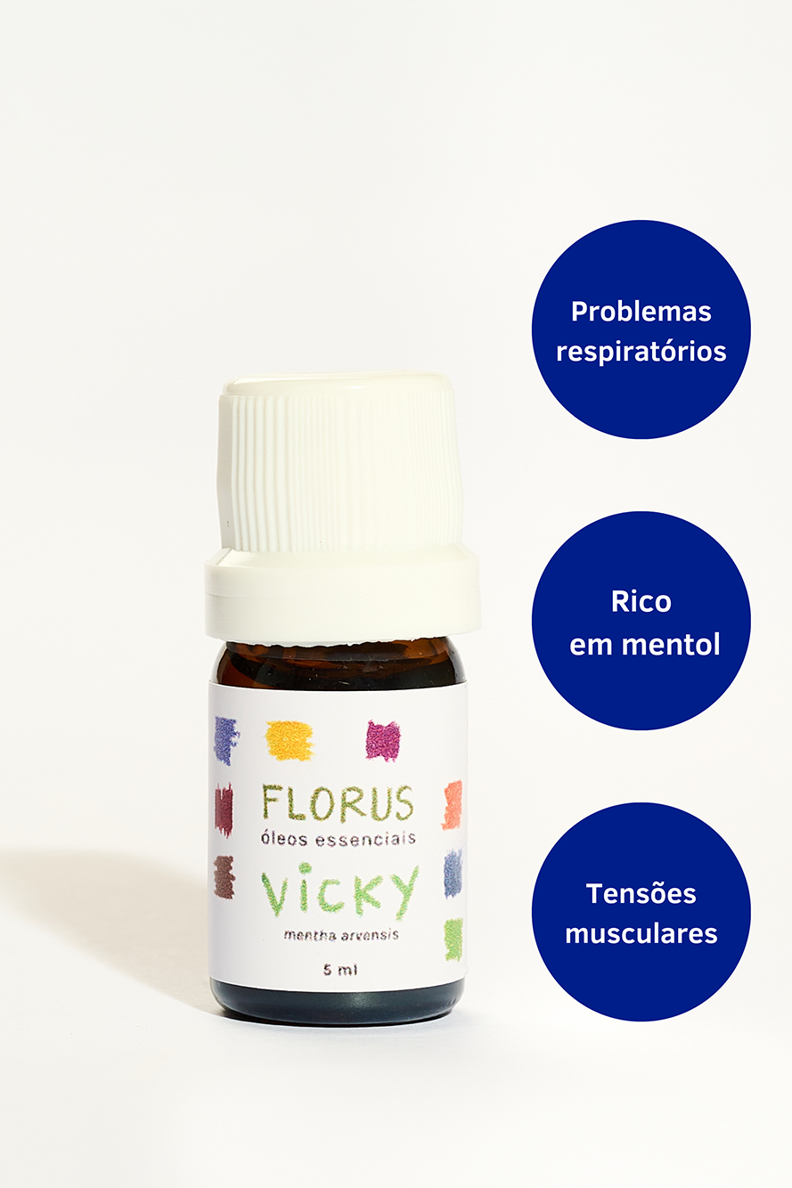 O óleo essencial de Vicky, por ser rico em mentol, é conhecido por seus efeitos refrescantes e calmantes, tornando-se um ótimo aliado no tratamento de gripes, resfriados, sinusites e problemas respiratórios, em geral. Além disso, também pode atuar no alívio de tensões musculares, articulares e na manutenção da circulação saudável.