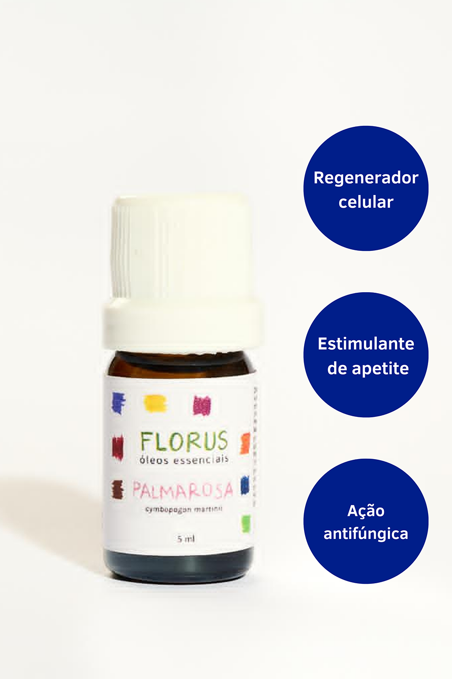 PROPRIEDADES FÍSICAS O óleo essencial de Palmarosa possui propriedades antifúngicas, antibacterianas e antissépticas. Pode ser um ótimo aliado na regeneração e clareamento da pele, atuando contra rugas, flacidez, dermatite, cicatrizes e envelhecimento precoce. O uso do óleo também pode atuar como estimulante de apetite e auxiliar na diminuição da febre.
